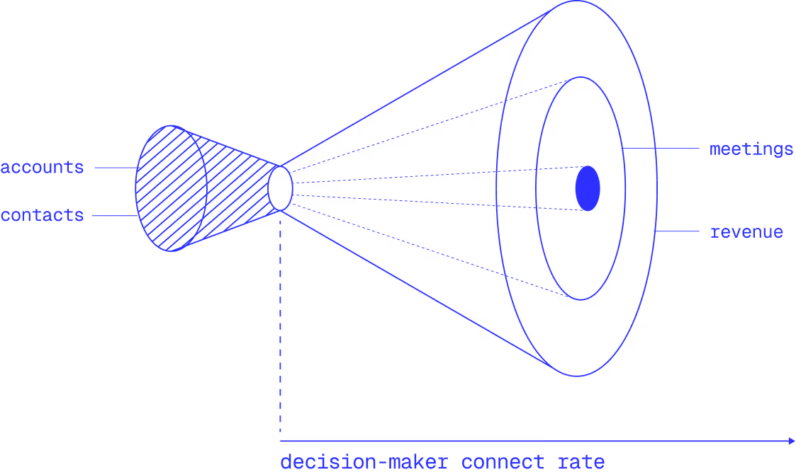 In trying to measure this, most teams consider every phone number as equal. Business phone numbers, however, rarely get you on the line with decision makers. Per our data, main line connect rates of 3–7% are drastically lower than owner mobile connect rates of 12–18%. Double your connect rate, and you double the efficiency of your entire org.